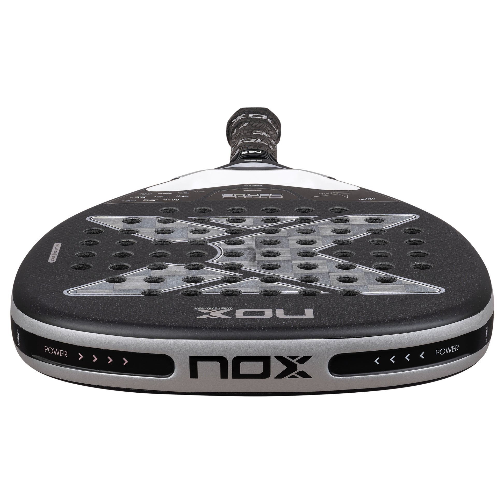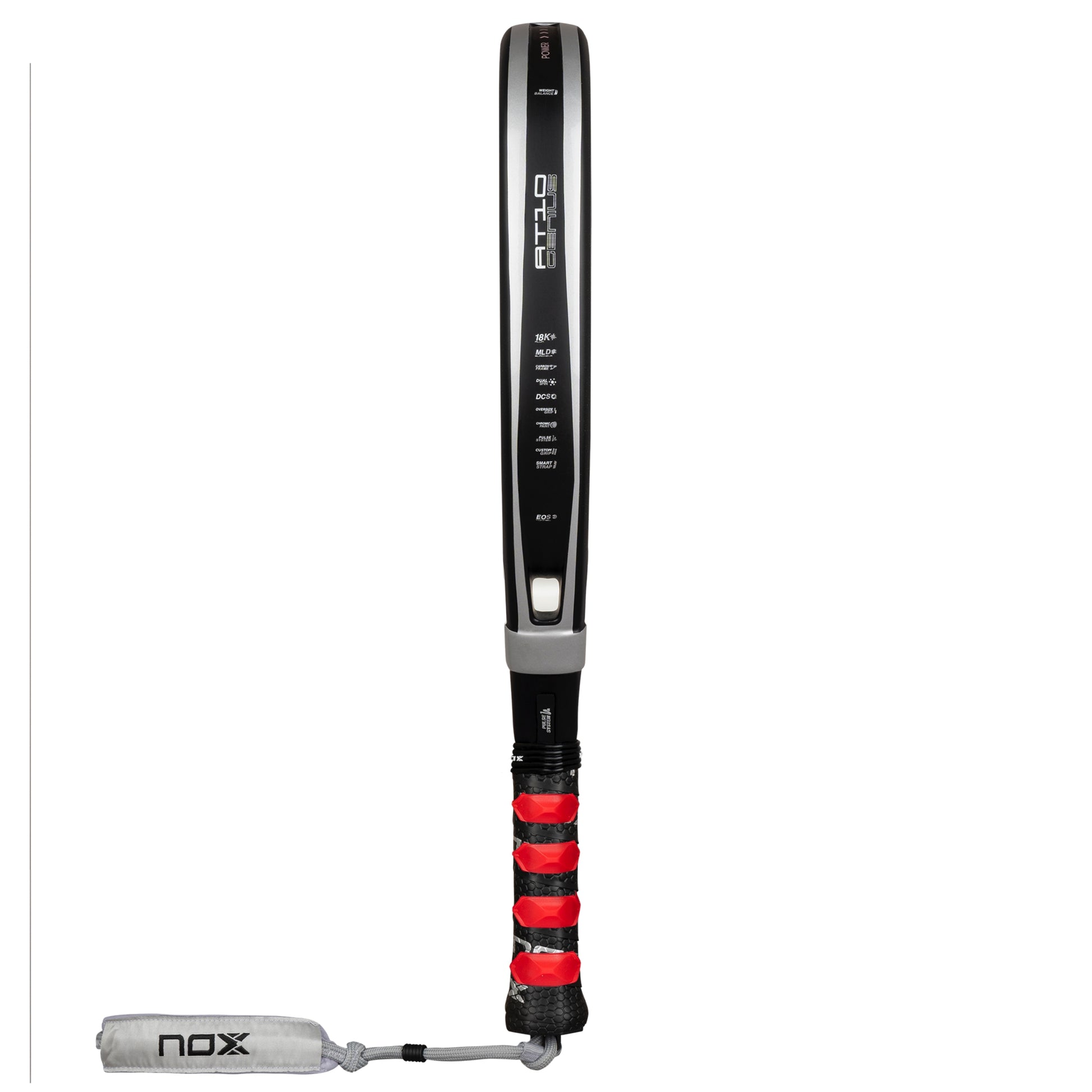 The carbon frame features the Dynamic Composite Structure, applying more material from the frame edge to four centimetres into the face, minimising hardness differences and reducing the risk of fibre breakage when hitting powerful shots. The Pulse System reduces vibrations with lateral rubbers running from the base of the frame to the bottom cap, whilst the Oversize Grip extends 30mm for players who prefer a longer handle for increased leverage and two-handed shots. The patented NOX Custom Grip technology, certified by Testea Padel, increases grip and reduces vibrations for supreme comfort during aggressive play. Below this, the Smartstrap system allows quick strap replacement without removing the bottom cap.